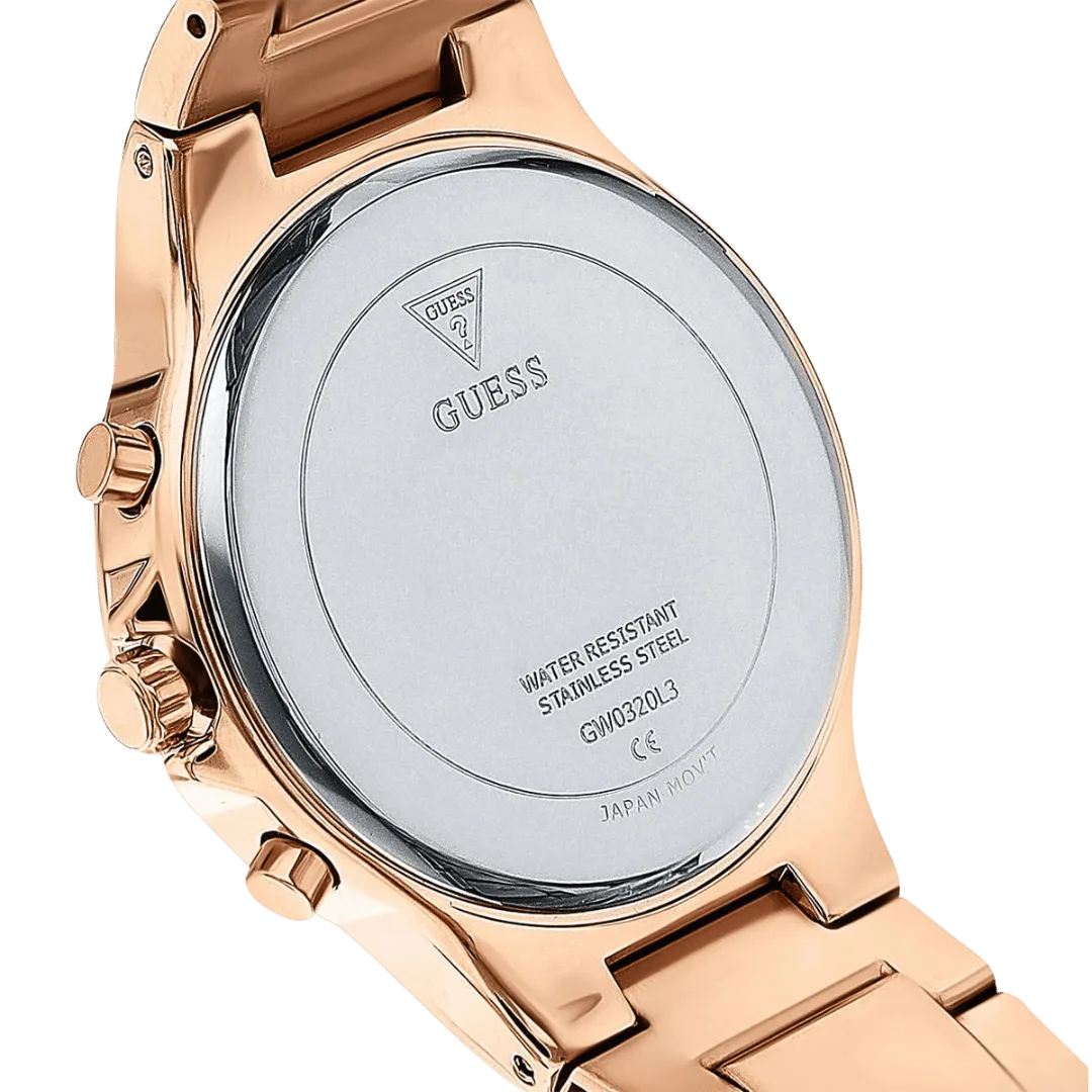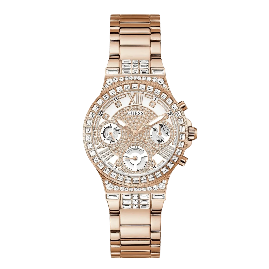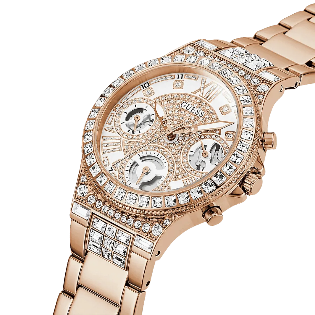 Original GUESS GW0320L3 Ladies Sport Multifunction Glitz with Crystals 36mm Watch – Pink Dial Rose Gold-Tone Stainless Steel Case & Bracelet