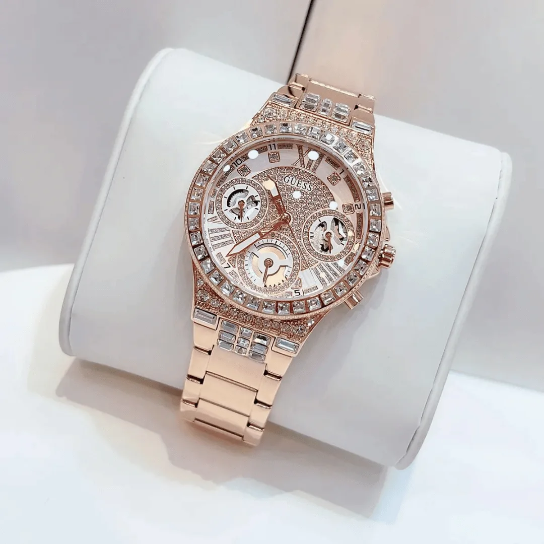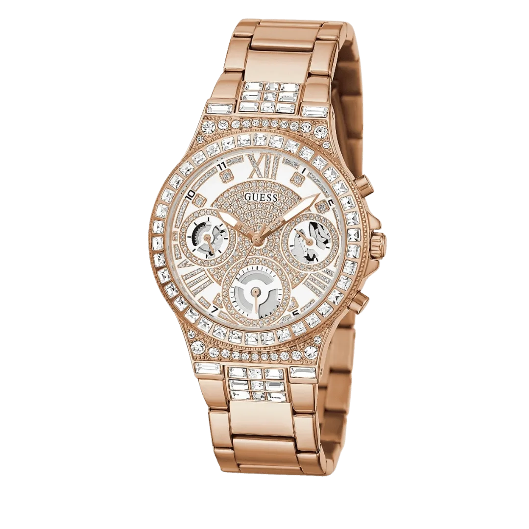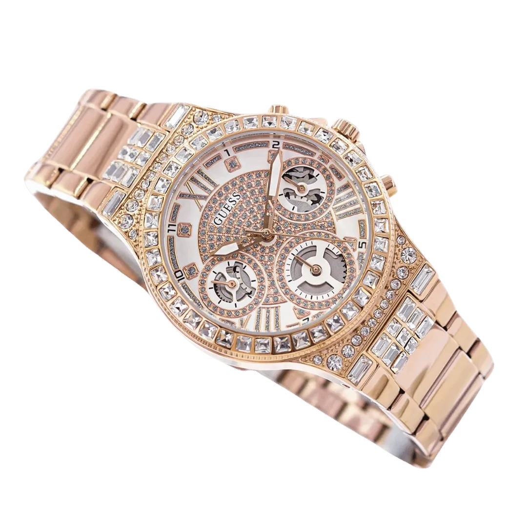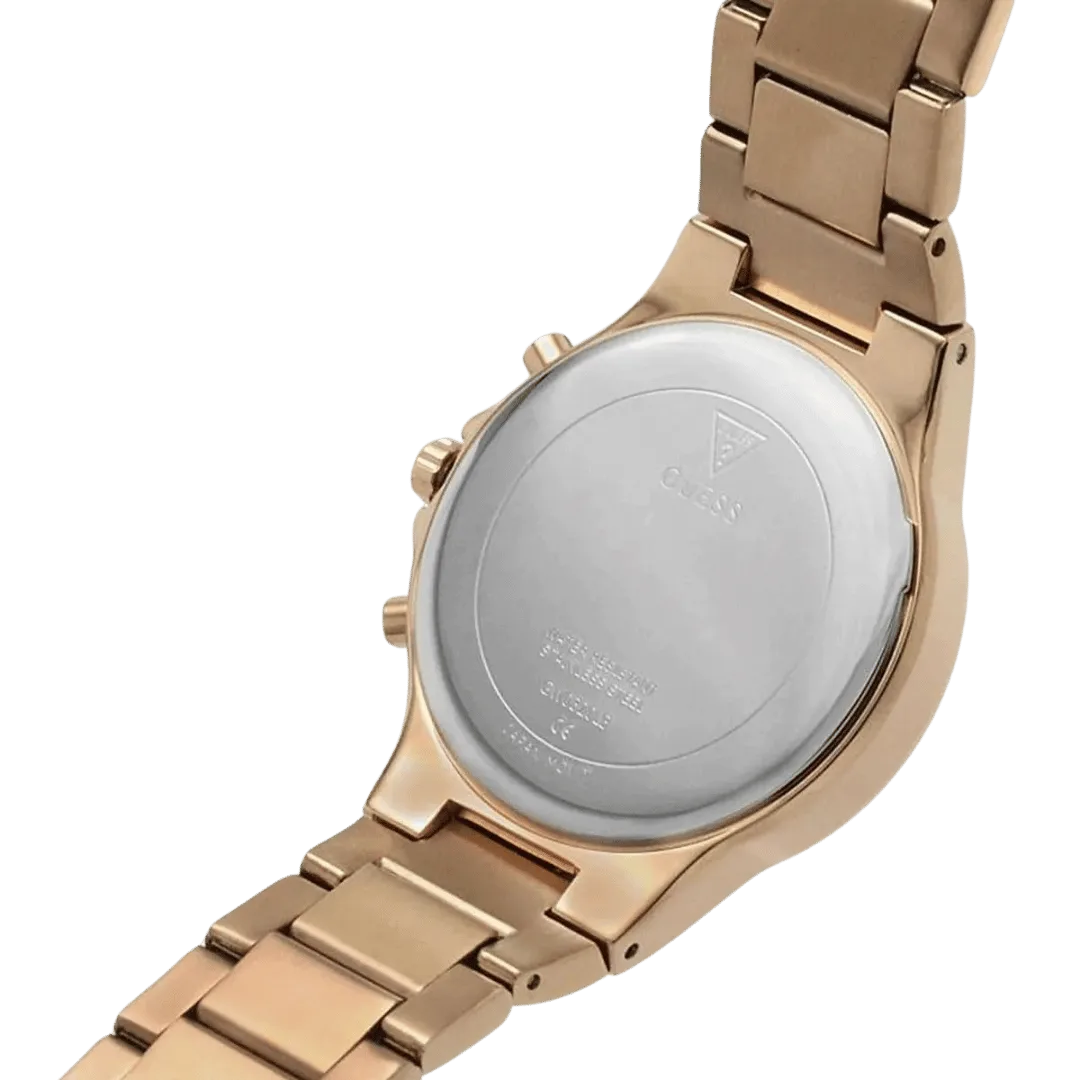 Original GUESS GW0320L3 Ladies Sport Multifunction Glitz with Crystals 36mm Watch – Pink Dial Rose Gold-Tone Stainless Steel Case & Bracelet