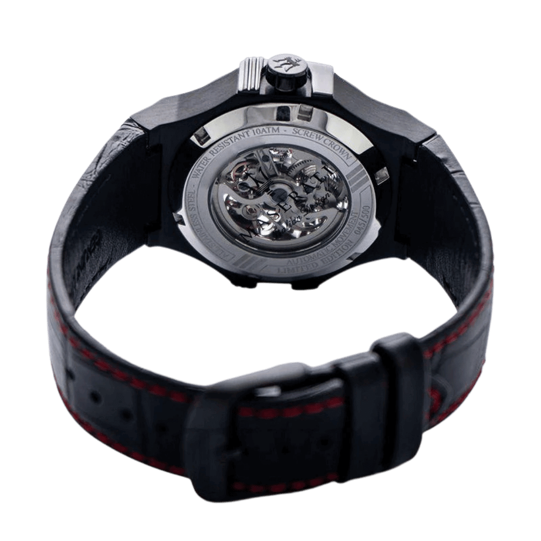 Original Maserati Potenza Automatic Watch R8821108008 – Classic Black Dial – Black Leather Strap – Automatic Movement – A sleek, all-black timepiece with a transparent case back. ‘This Watch is brand new and 100% Authentic, and Comes with it’s original box, Bag, tags, and instruction manual”