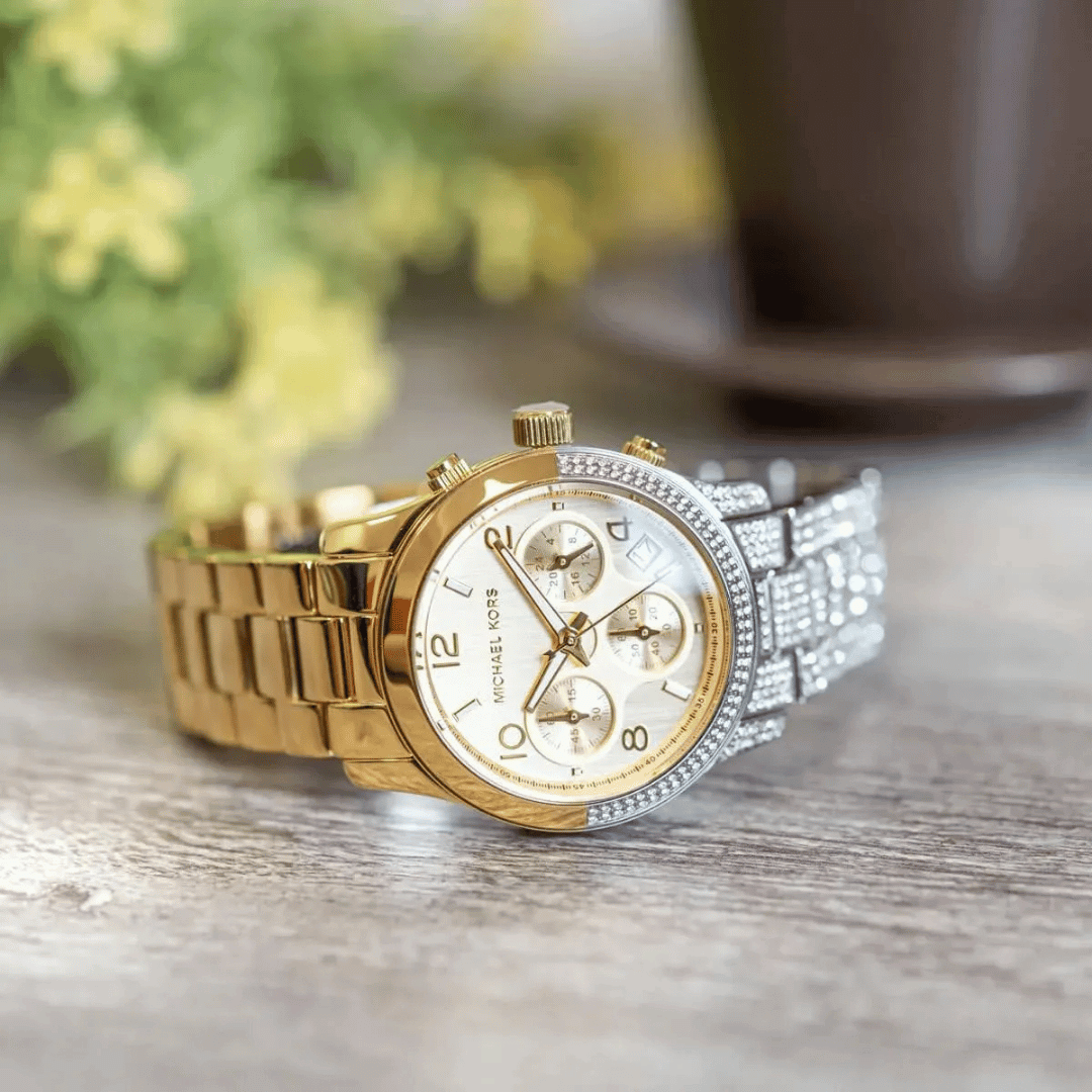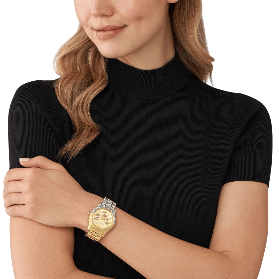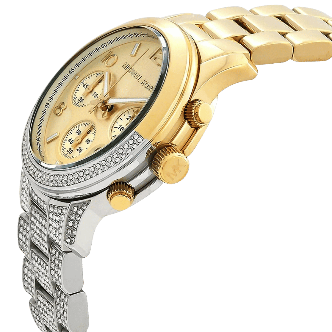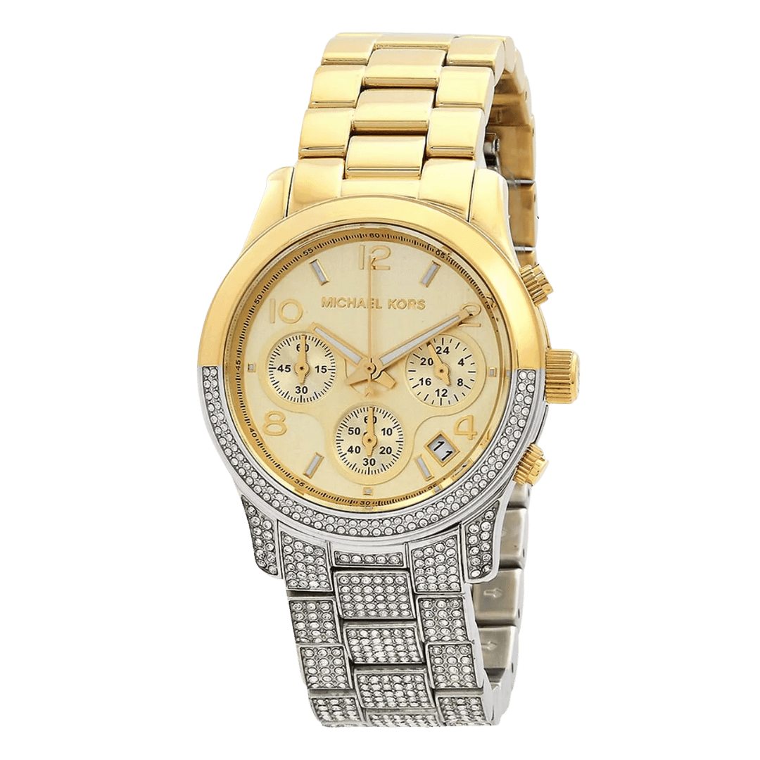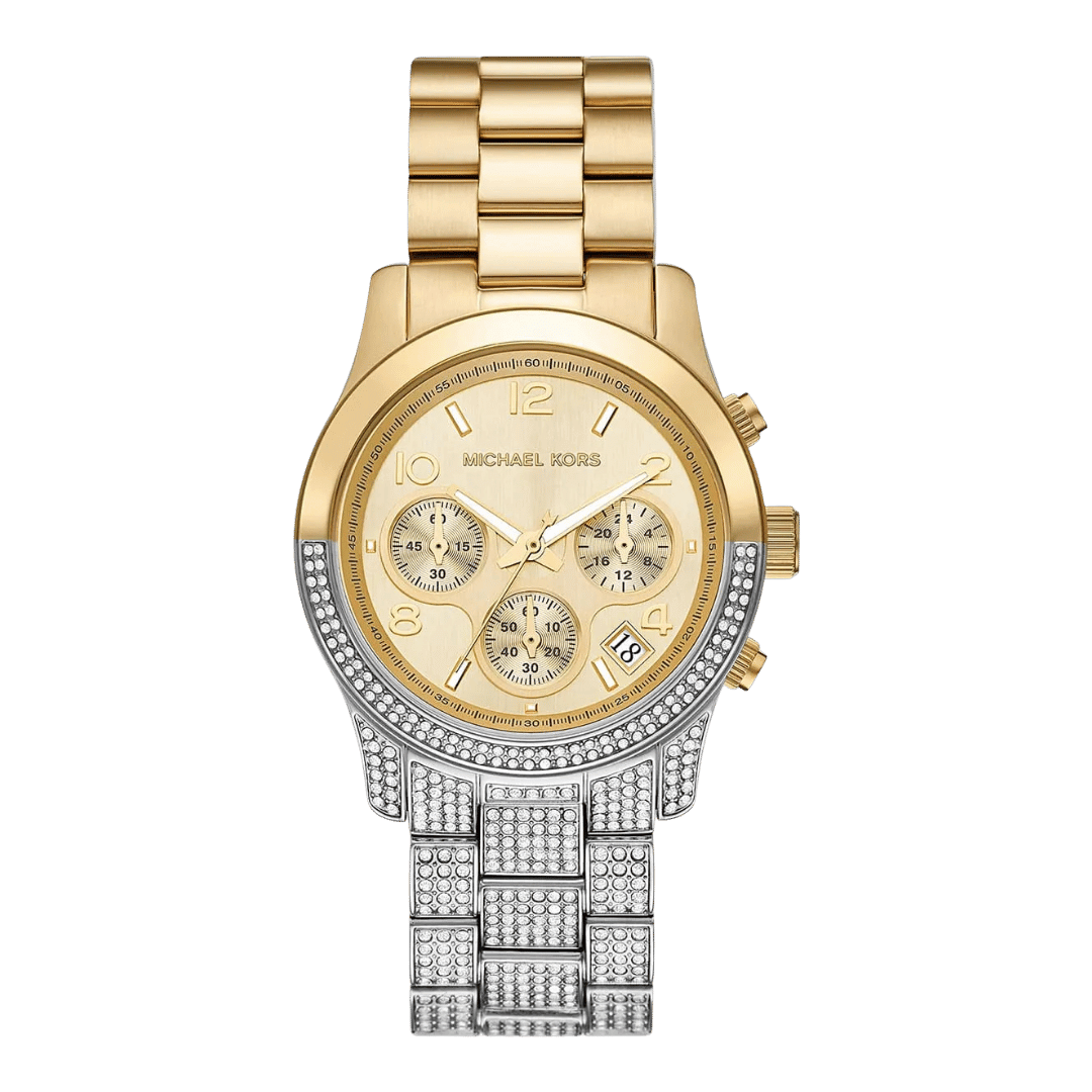 Original Michael Kors Watch For Women Runway MK7329 Chronograph. With Gold dial , Featured with Crystals decorated