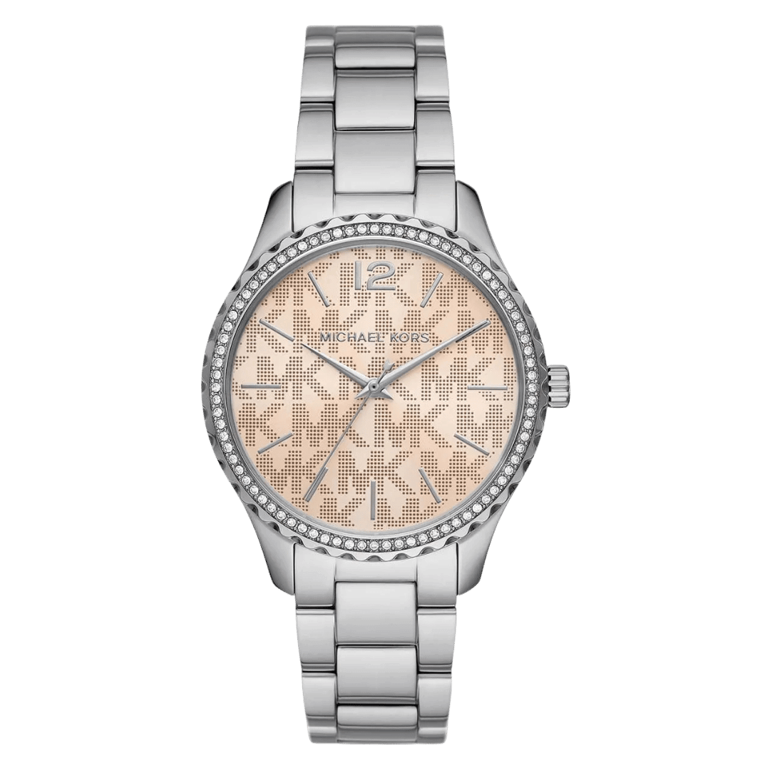 Original Michael Kors Watch For Women Layton MK7298. With Pink dial , Featured with MK Logo patterned dial. Stainless steel Metal belt with Silver color. “This Watch is brand new and 100% Authentic, and Comes with its original box, Bag, tags, and instruction manual.”
