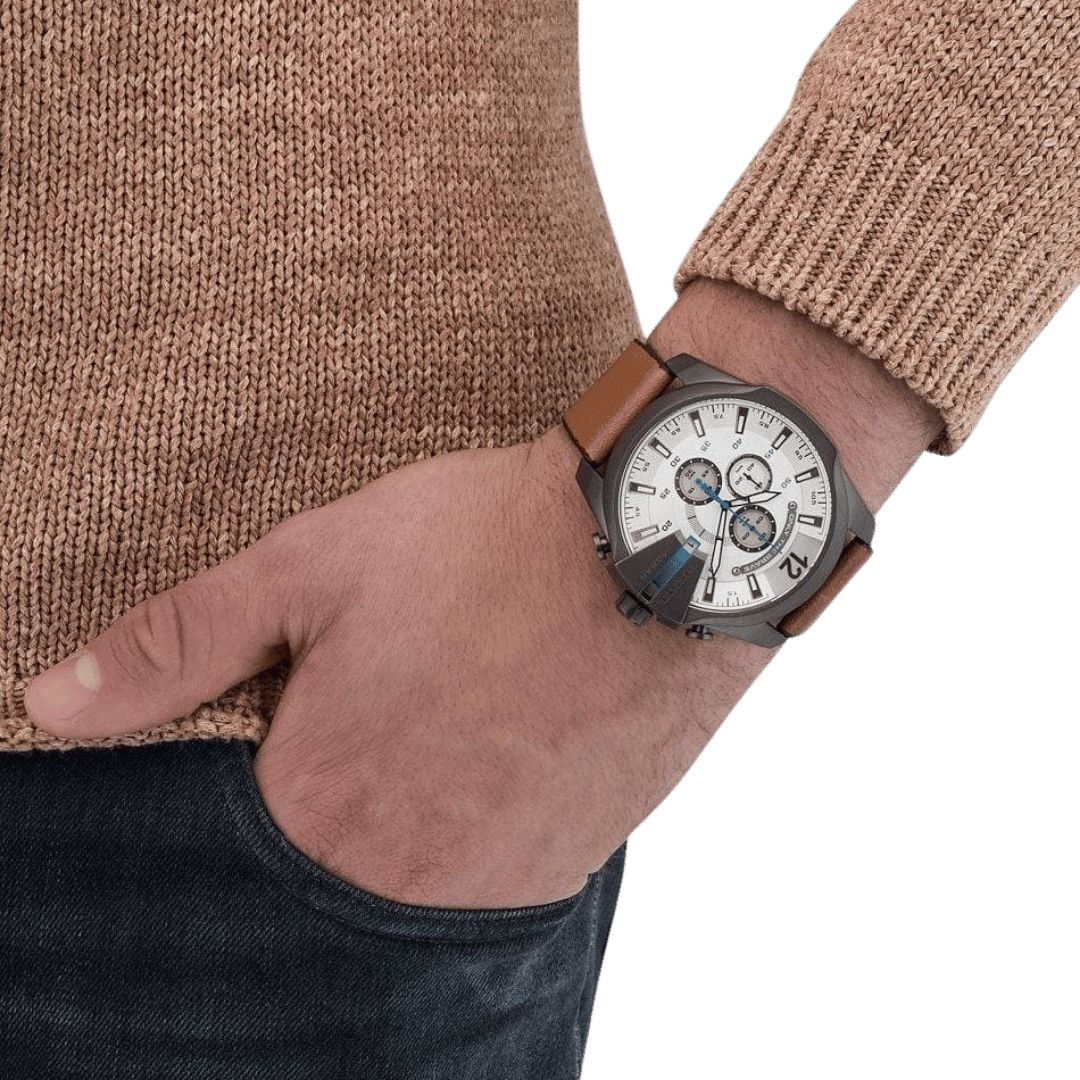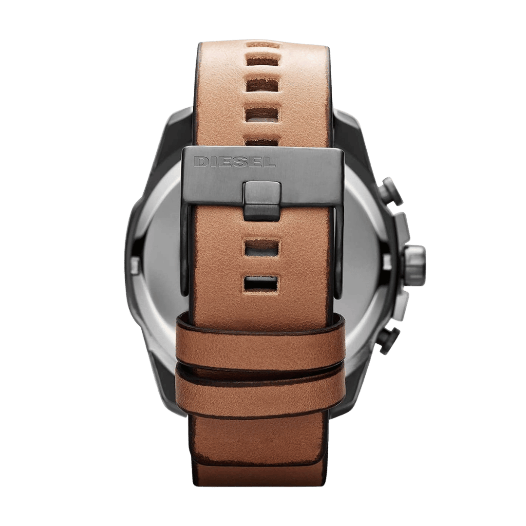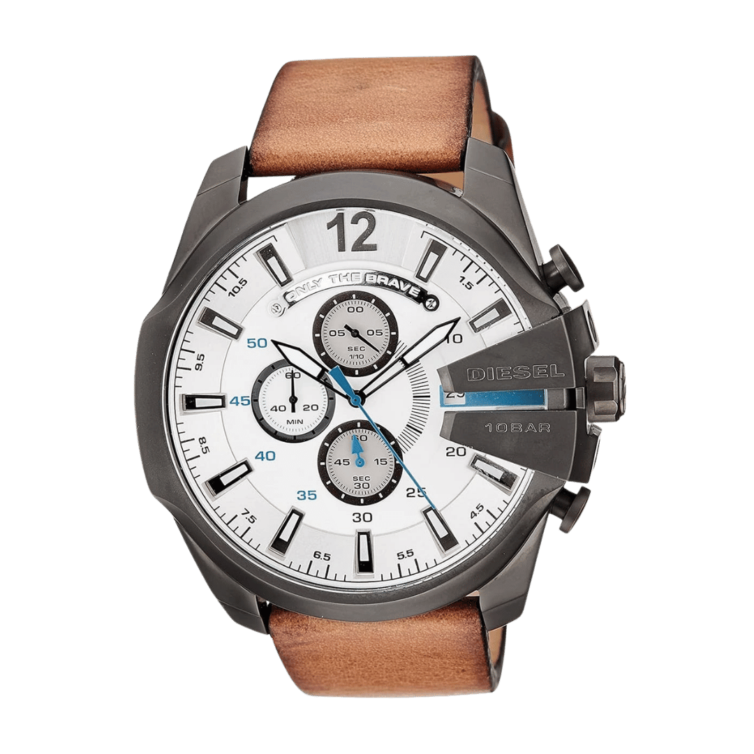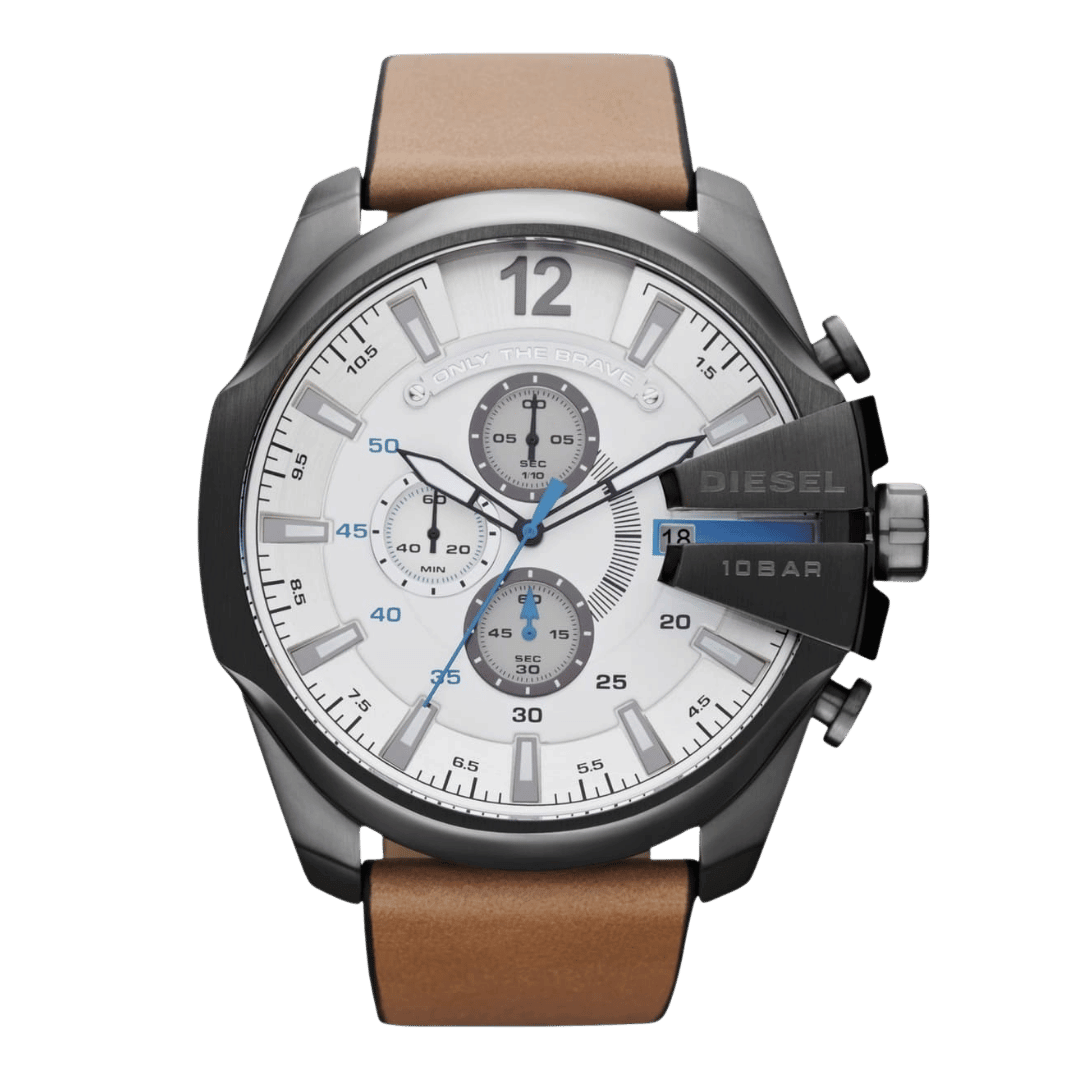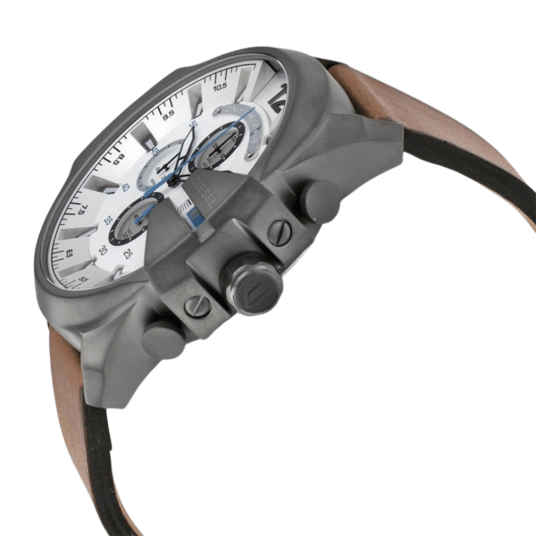 Original Diesel Watch Mega Chief Chronograph for Men DZ4280 – Chronograph Quartz Movement – White Dial – Brown Leather Strap with Gray Stainless Steel Case – ”This Watch is brand new and 100% Authentic, and Comes with it’s original box, Bag, tags, and instruction manual”