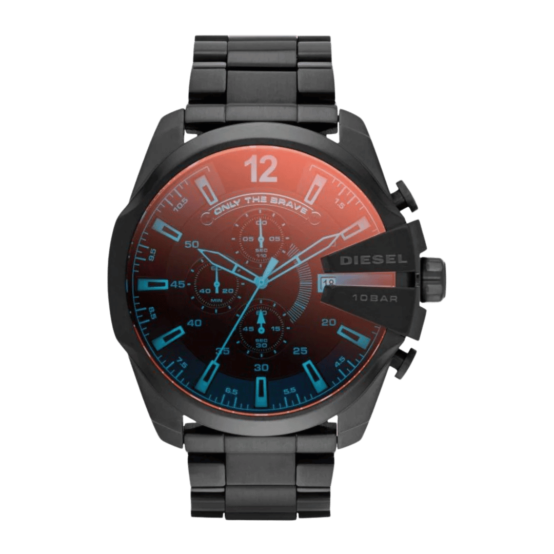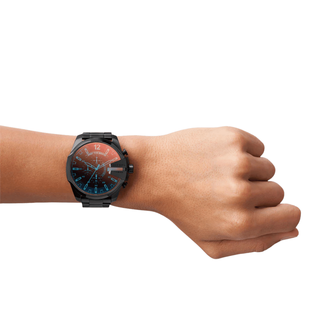 Original Diesel Watch Mega Chief Chronograph for Men DZ4318 – Chronograph Quartz Movement – Black Dial with Iridescent Crystal – Black Ion-Plated (PVD) Stainless Steel Case and Bracelet – ”This Watch is brand new and 100% Authentic, and Comes with it’s original box, Bag, tags, and instruction manual”
