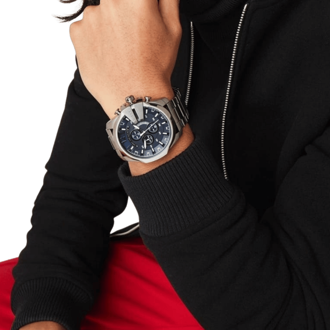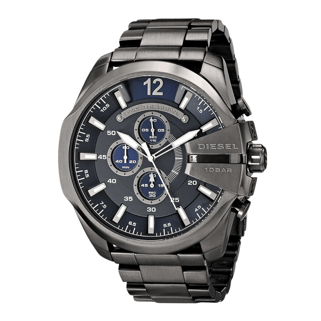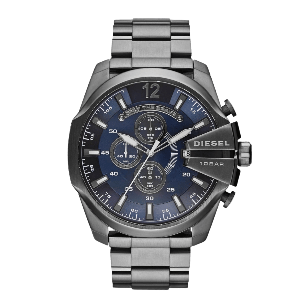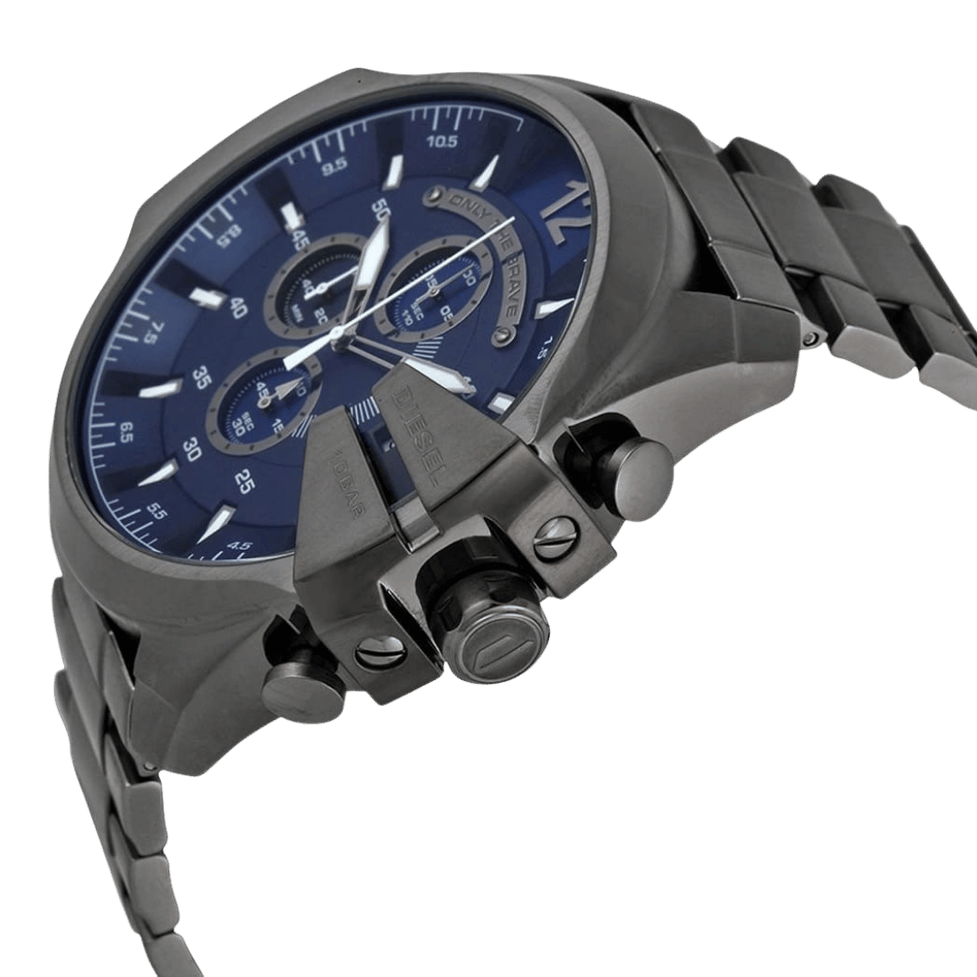 Original Diesel Watch Mega Chief Chronograph for Men DZ4329 – Chronograph Quartz Movement – Blue Dial – Grey Stainless Steel (Gunmetal-plated) Case and Bracelet. – ”This Watch is brand new and 100% Authentic, and Comes with it’s original box, Bag, tags, and instruction manual”