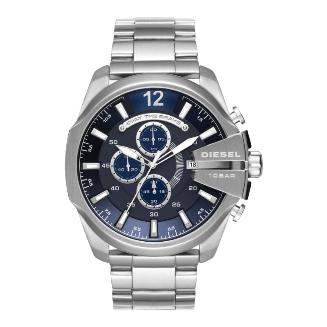 Original Diesel Watch Mega Chief Chronograph for Men DZ4417 – Chronograph Quartz Movement – Blue Dial – Silver Stainless Steel Case and Bracelet. . ”This Watch is brand new and 100% Authentic, and Comes with it’s original box, Bag, tags, and instruction manual”