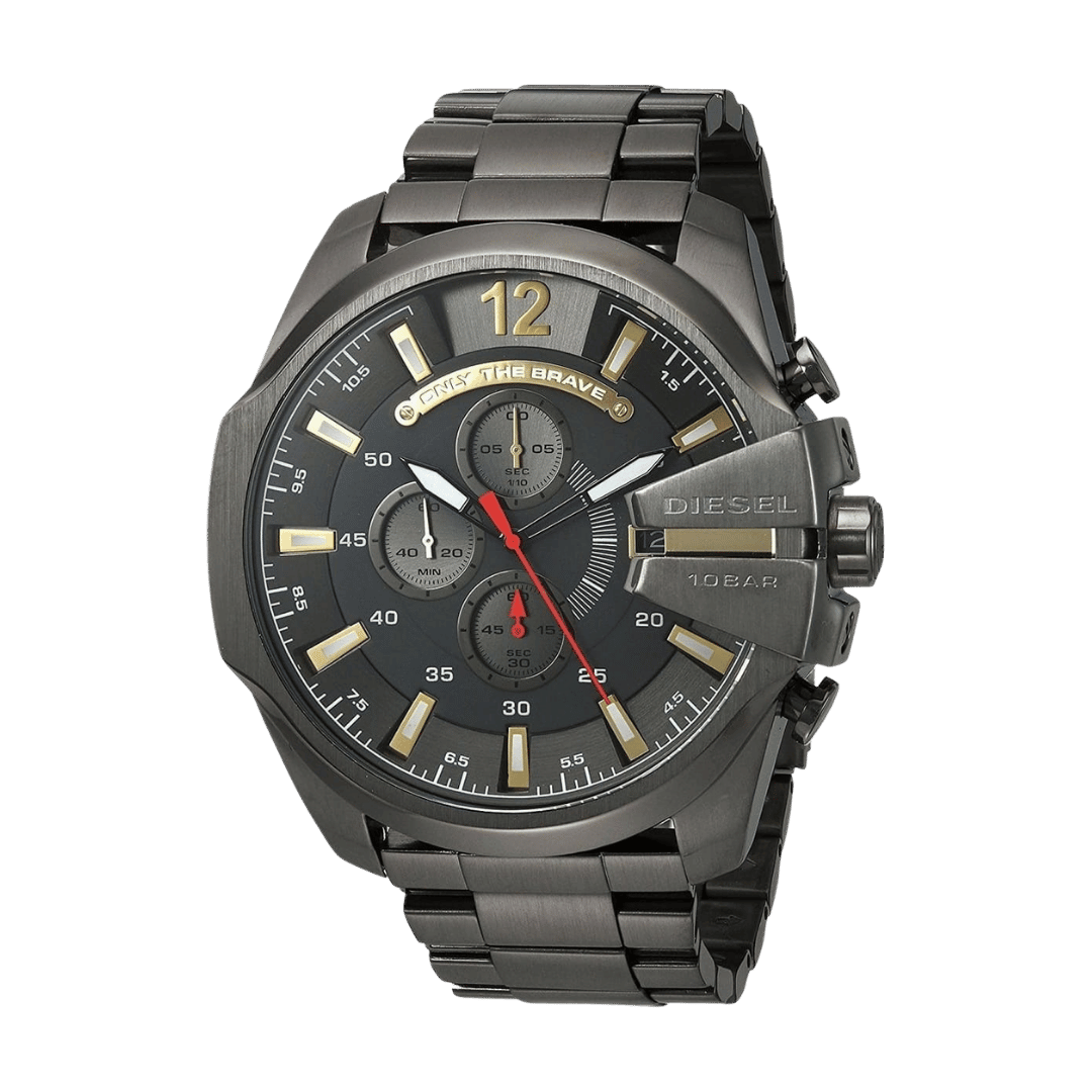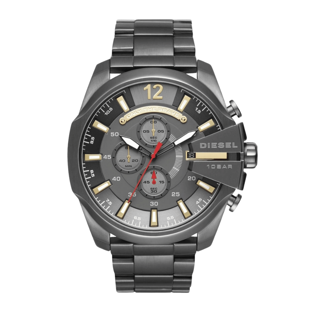 Original Diesel Watch Mega Chief Chronograph for Men DZ4421 – Chronograph Quartz Movement – Grey Dial with Gold-Tone Accents – Grey Ion-Plated Stainless Steel Case and Bracelet. – ”This Watch is brand new and 100% Authentic, and Comes with it’s original box, Bag, tags, and instruction manual”