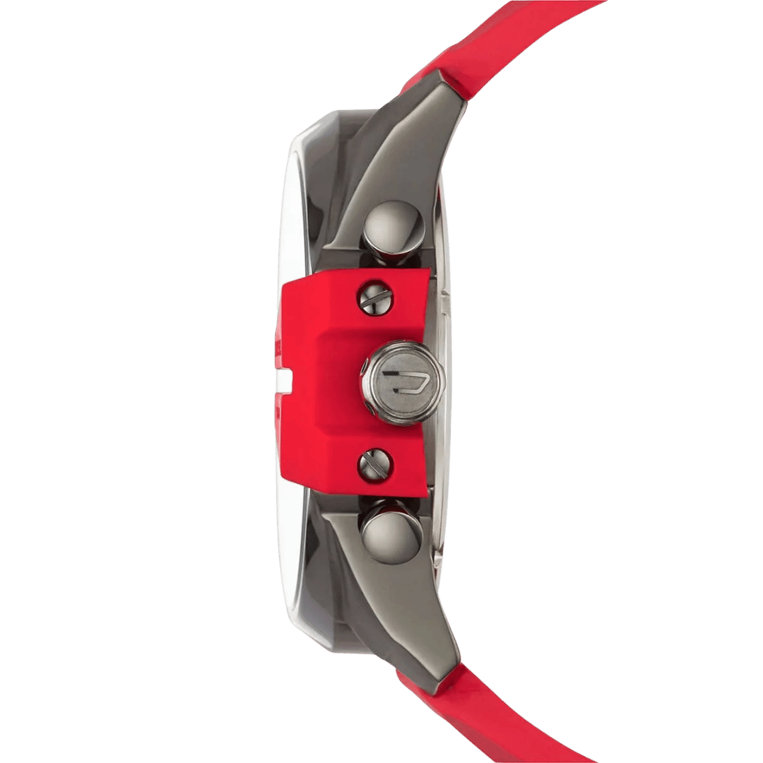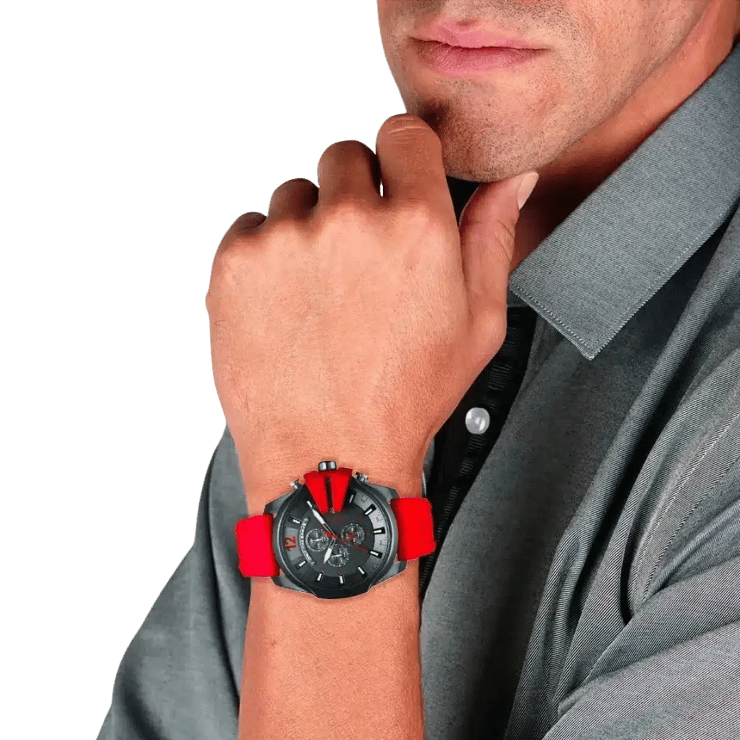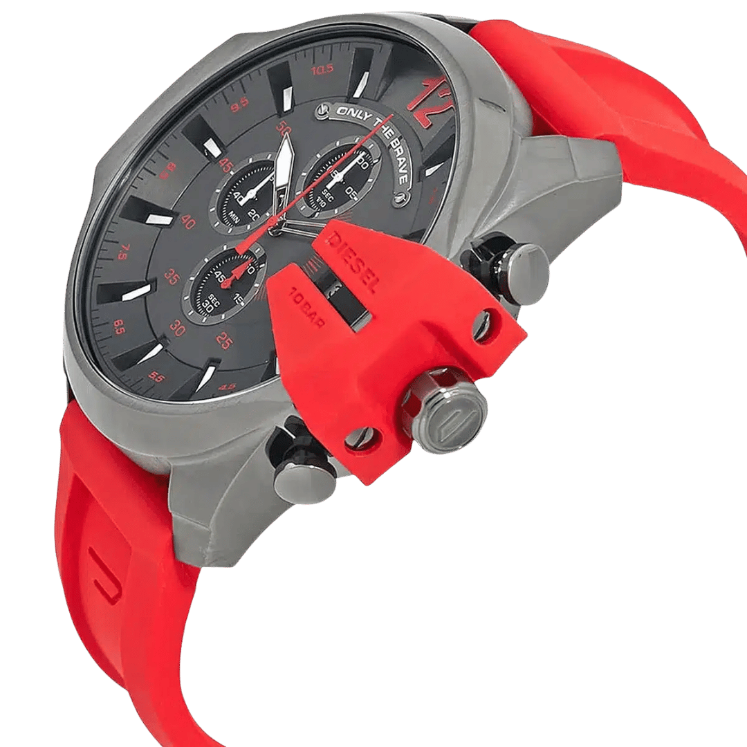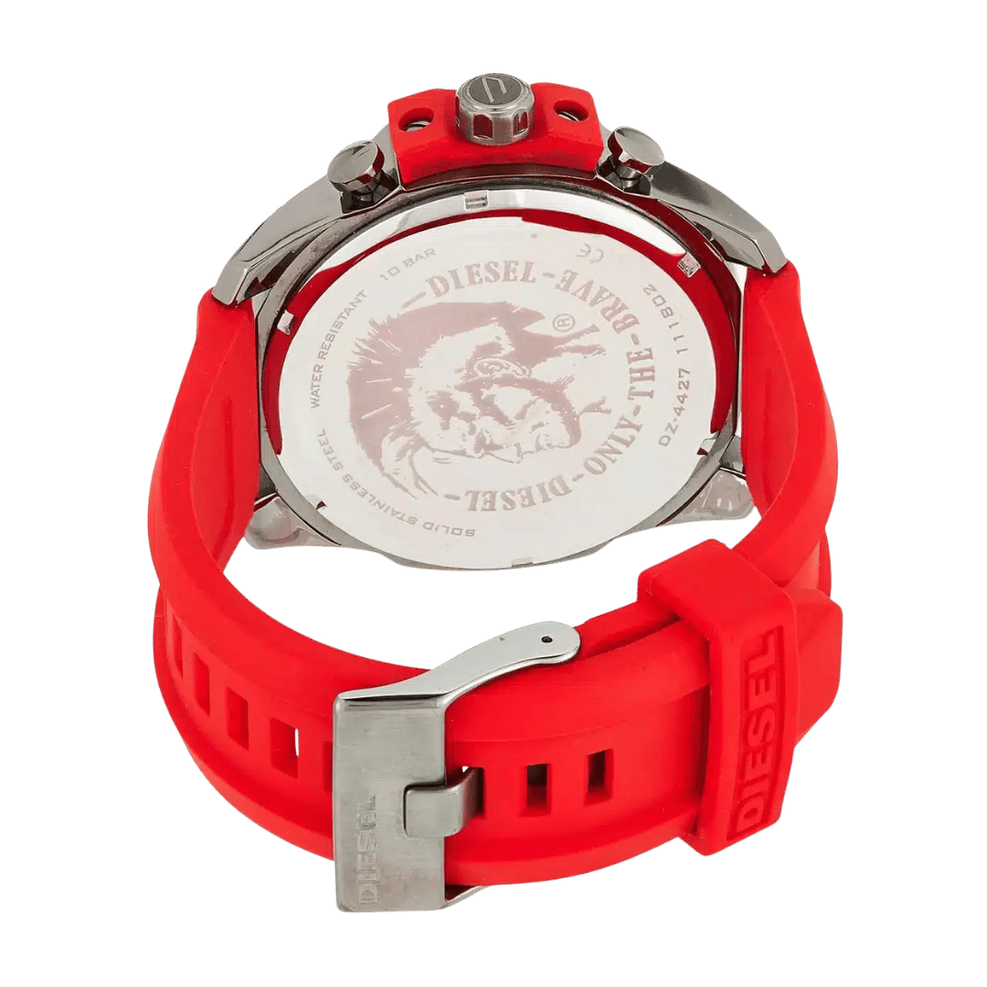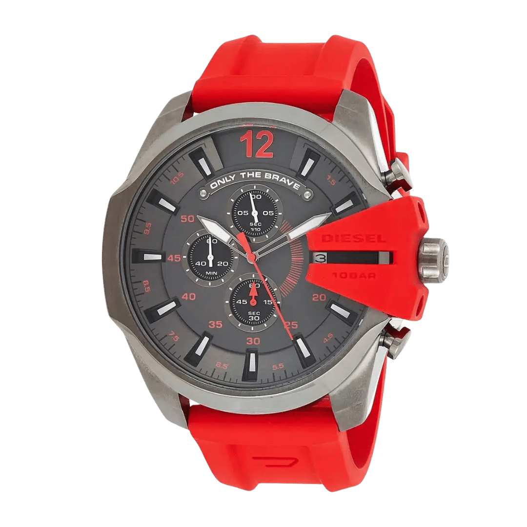Original Diesel Watch Mega Chief Chronograph for Men DZ4427 – Chronograph Quartz Movement – Grey Dial with Red Accents – Red Silicone Strap with Gray Stainless Steel Case. – ”This Watch is brand new and 100% Authentic, and Comes with it’s original box, Bag, tags, and instruction manual”