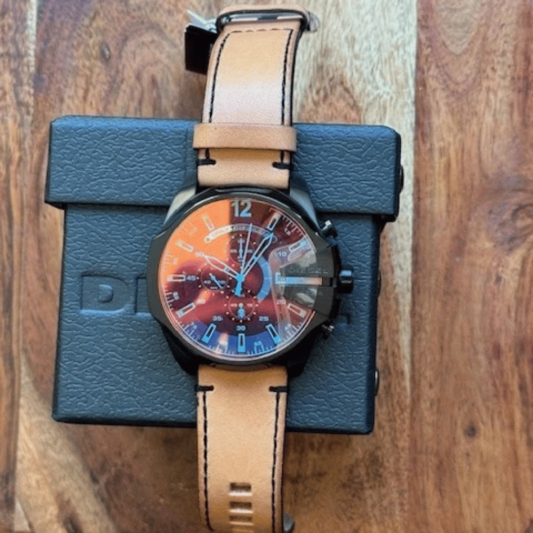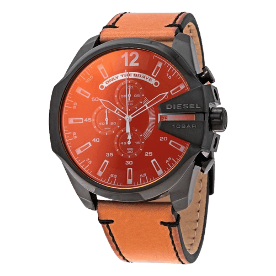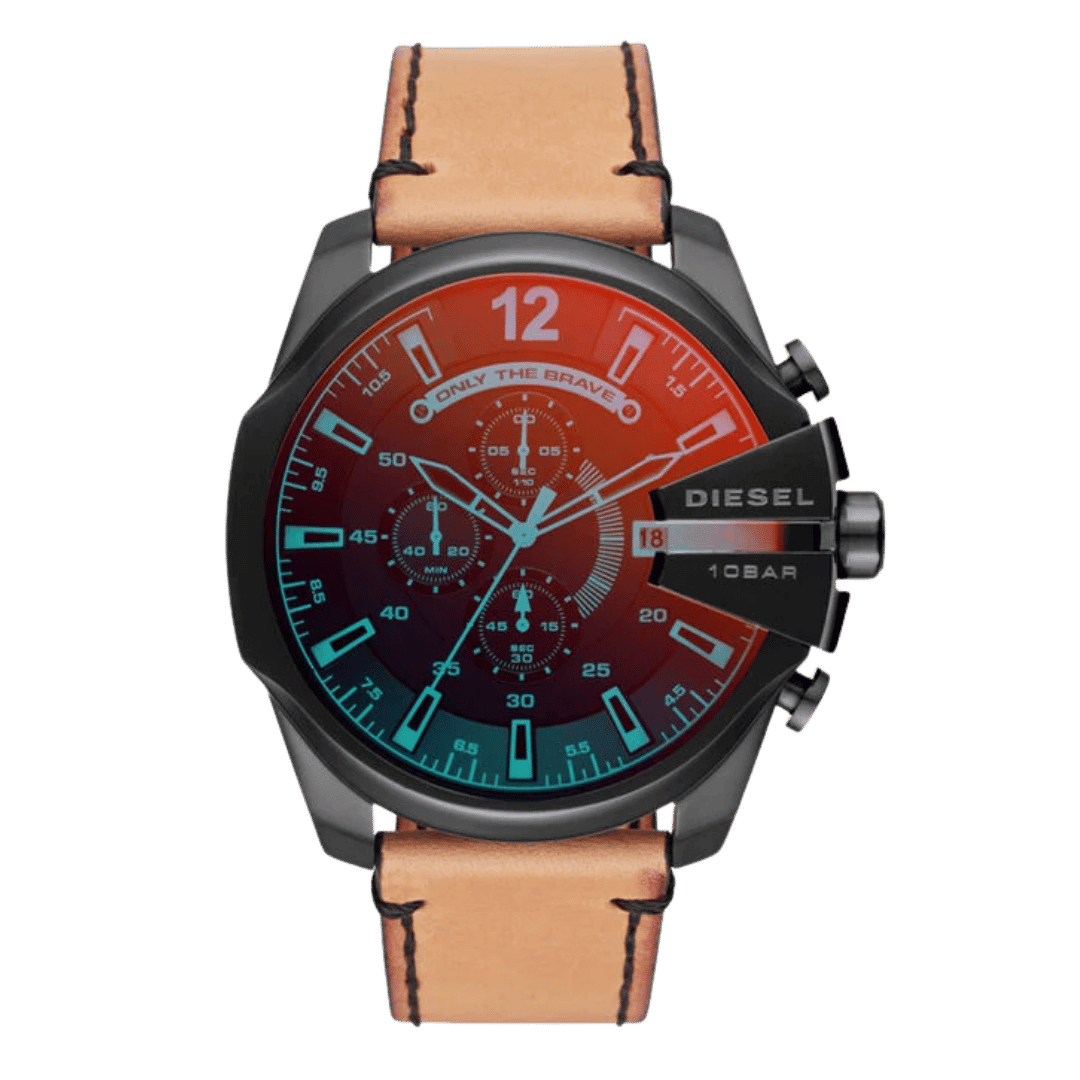 Original Diesel Watch Mega Chief Chronograph for Men DZ4476 – Chronograph Quartz Movement – Black Dial with Iridescent Crystal – Brown Leather Strap with Black Ion-Plated Case – ”This Watch is brand new and 100% Authentic, and Comes with it’s original box, Bag, tags, and instruction manual”