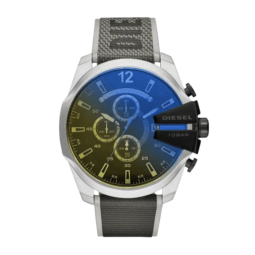 Original Diesel Watch Mega Chief Chronograph for Men DZ4523 – Chronograph Quartz Movement – Black Dial with Multi-Colour Accents – Multi-Colour Nylon Strap with Silver Stainless Steel Case – ”This Watch is brand new and 100% Authentic, and Comes with it’s original box, Bag, tags, and instruction manual”