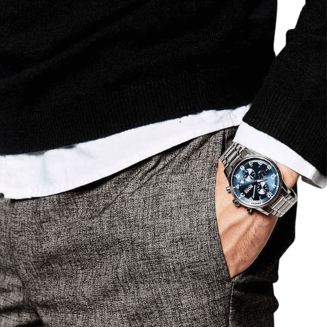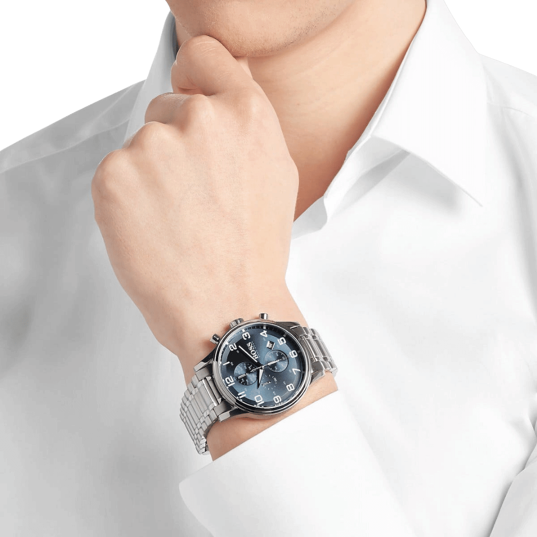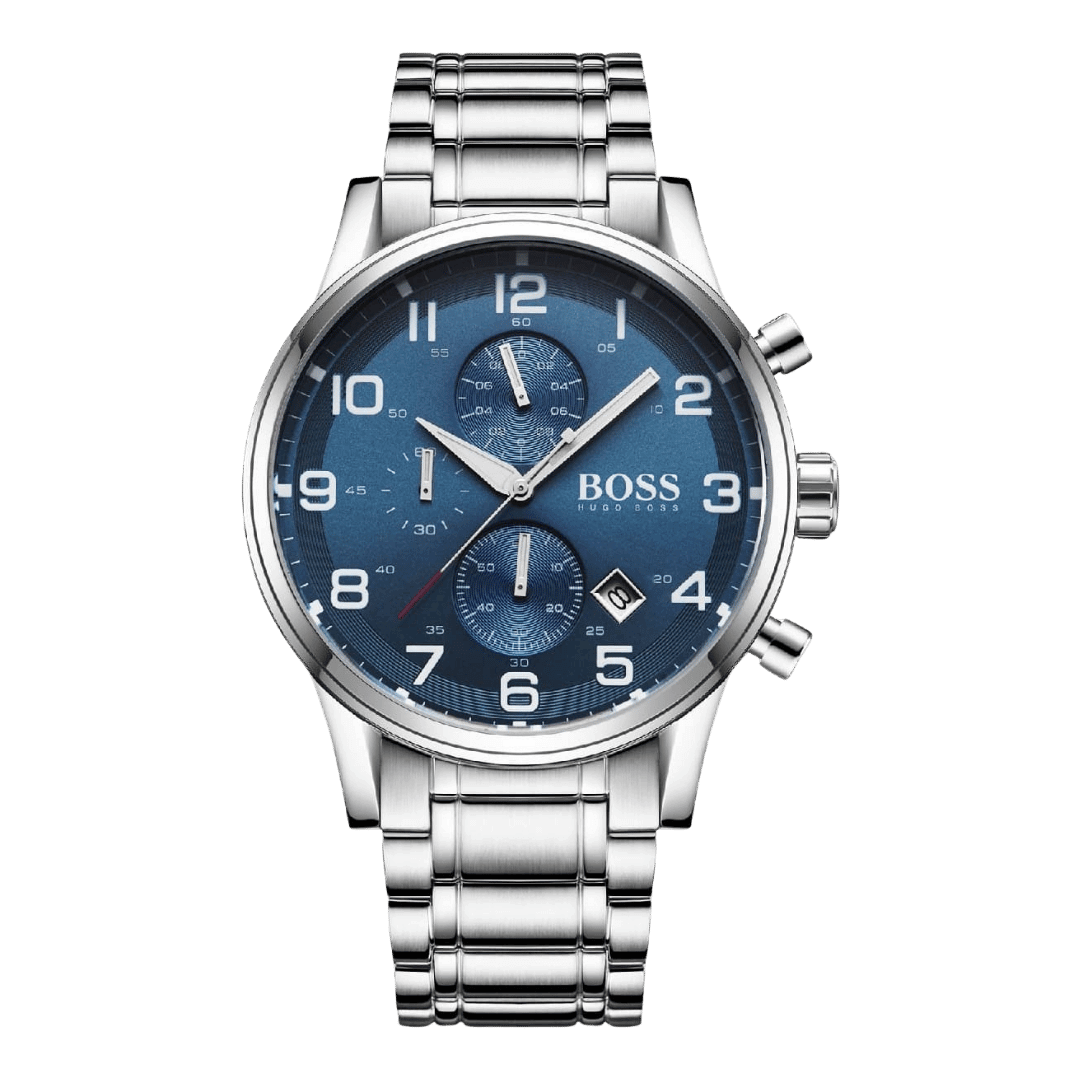 Original Hugo Boss Watch HB.244.1.14.2785 For Men Aeroliner 1513183 Chronograph -With Blue dial – Metal belt with Silver color . ”This Watch is brand new and 100% Authentic, and Comes with it’s original box, Bag, tags, and instruction manual”